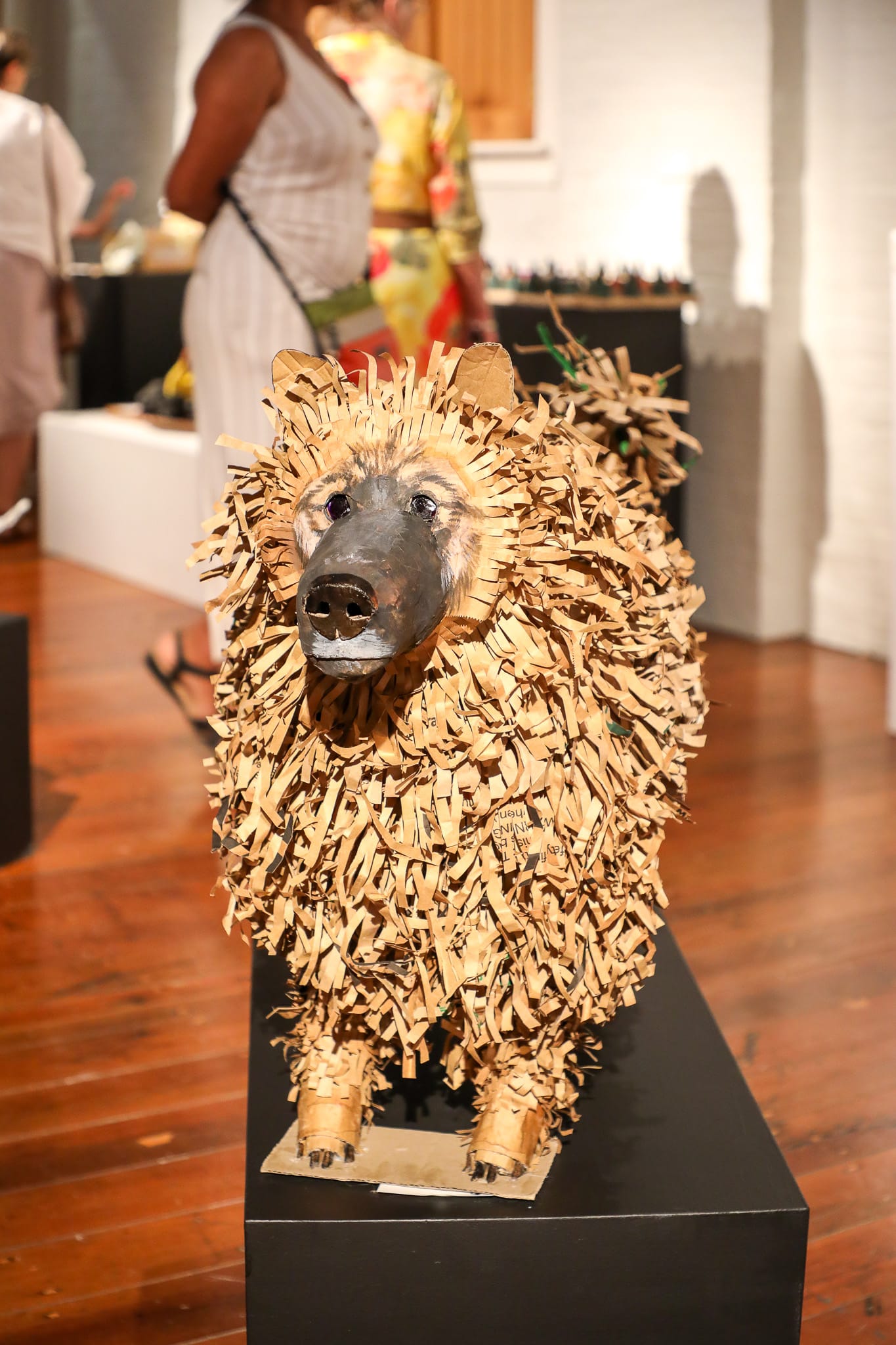 A CARDBOARD paper dog and a sunflower artwork created from discarded